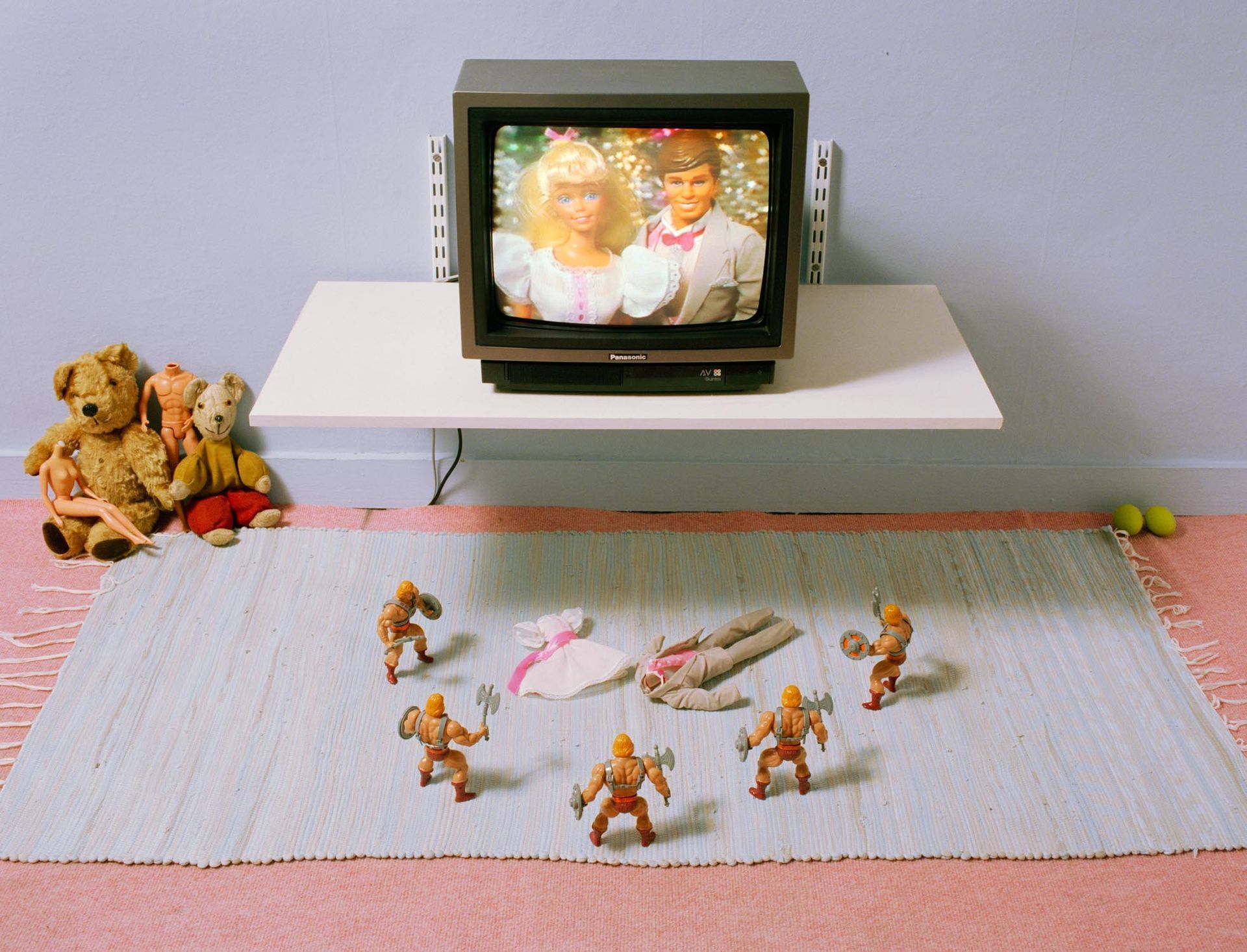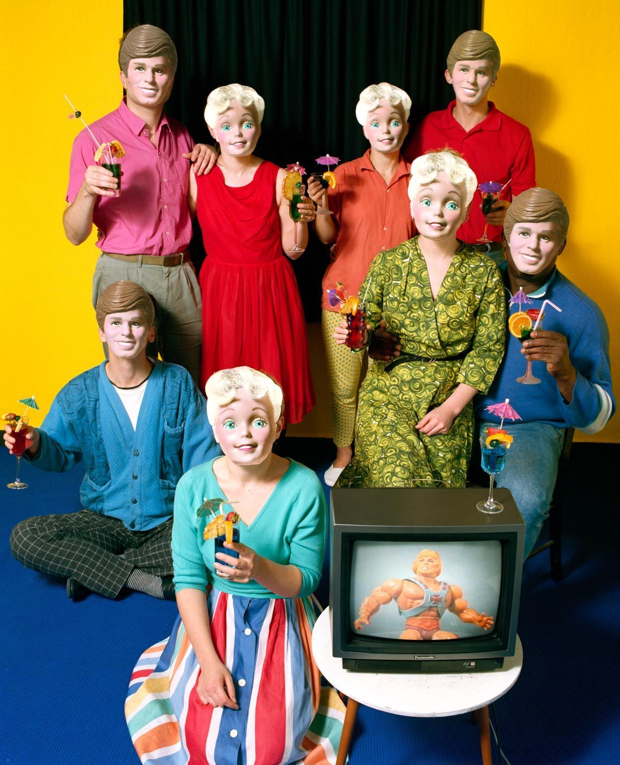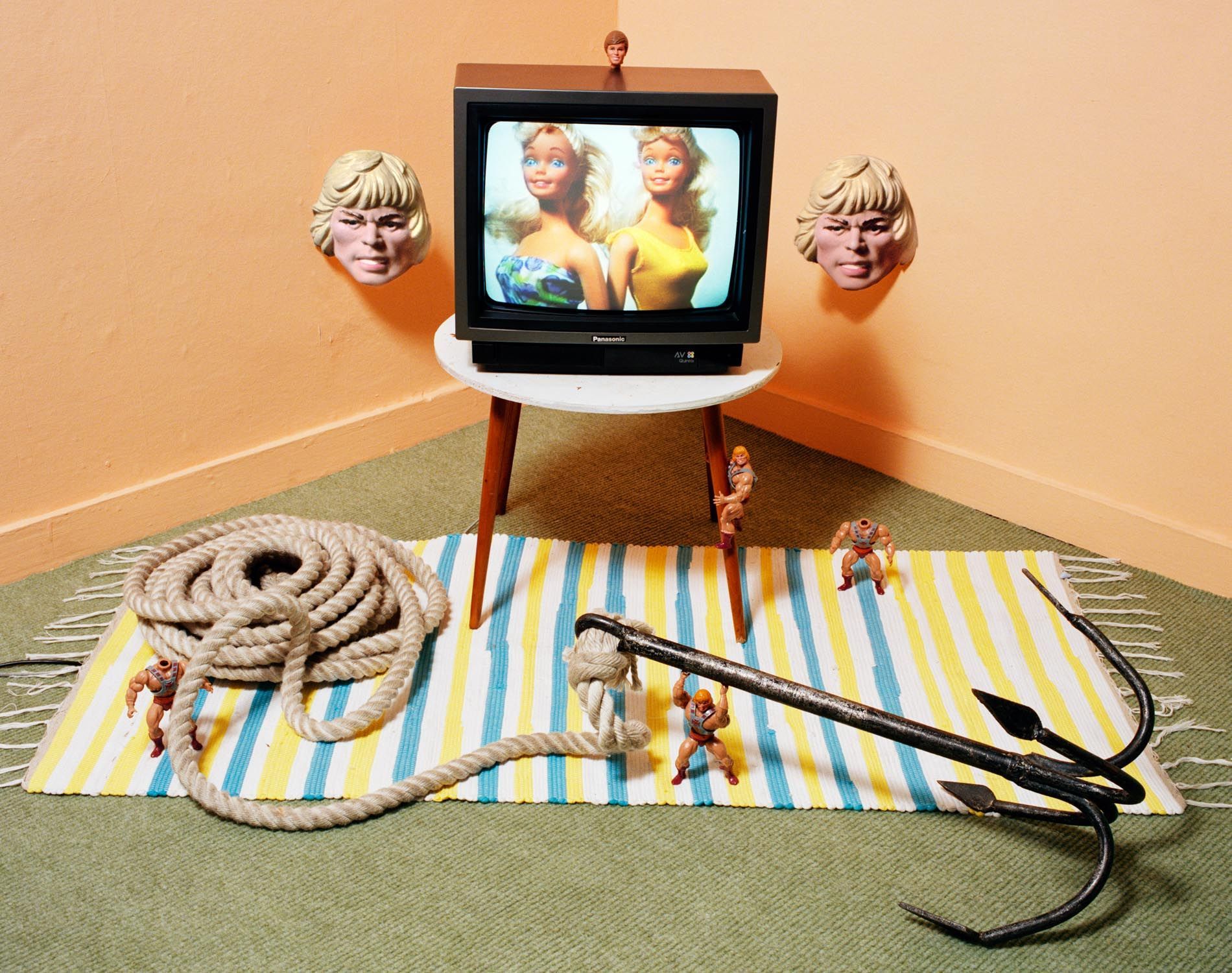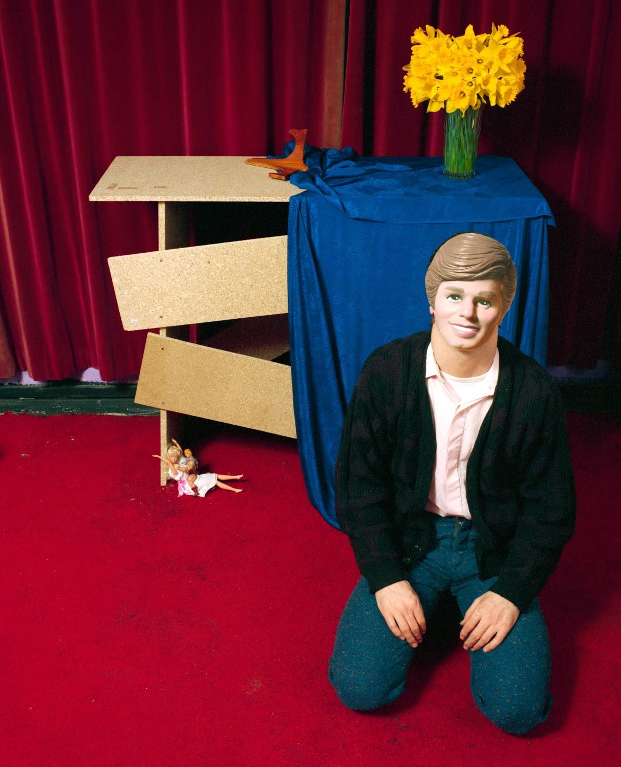 I made photographic masks of Barbie Doll, Ken Doll, and He-Man and actors wore the masks “in situ” in these constructed tableaux. These images were made before photoshop, so they are single exposure images.